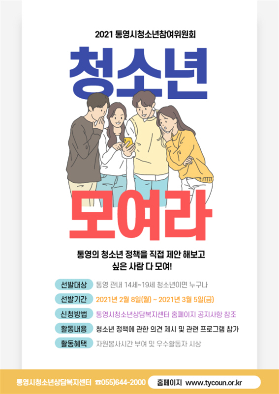 [한국Q뉴스] 통영시 청소년상담복지센터는 2021년 2월 8일부터 3월 5일까지 관내 청소년을 대상으로 ‘2021년 통영시 청소년참여위원회’위원을 모집한다.