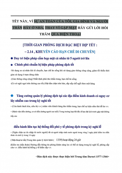이번 안내문에는 설 연휴기간 이동자제, 5인 이상 사적모임 금지조치 등 사회적 거리두기 2단계 방역수칙 내용과 증상발현 시 무료로 선별검사를 받을 수 있는 내용이 포함됐다.