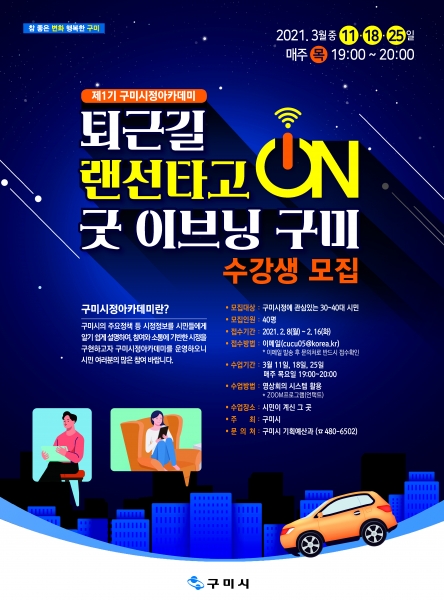 이번 제1기 구미시정아카데미는 시정참여가 대체로 낮은 30~40대 구미시민 40명을 대상으로 ‘퇴근길 랜선타고 ON 굿 이브닝 구미’ 테마로 개강하며 퇴근 후 여가시간을 활용해 집에서 구미의 이야기를 나누는 비대면 소통의 시간으로 만들어 갈 것이다.