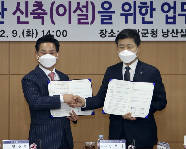 [한국Q뉴스] 전라남도교육청과 영암군이 2월 9일 영암군청 낭산실에서 장석웅 교육감, 전동평 군수를 비롯한 두 기관 관계자들이 참석한 가운데 영암공공도서관 신축을 위한 업무협약을 체결했다.