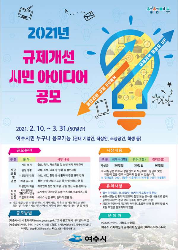 [한국Q뉴스] 여수시는 시민생활과 기업활동을 저해하는 불합리한 규제를 발굴·개선하고자 ‘2021년 규제개선 시민 아이디어’를 공모한다고 10일 밝혔다.