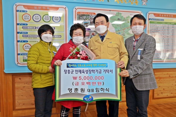 정종순 장흥군수는 “코로나19로 인한 불경기 속에서도 이웃돕기와 장흥 교육의 100년 대계를 위해 아름다운 기탁이 이어지고 있다”며 “학생들을 위해 장학기금을 소중하게 사용하겠다”고 감사의 말씀을 전했다.