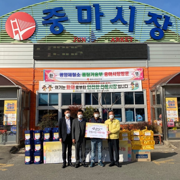 [한국Q뉴스] 광양시는 지난 5일 중마시장에서 국제구호개발 NGO 기아대책과 KB국민은행이 설 명절을 맞아 지역 내 저소득 소외계층 가정을 지원하는 ‘전통시장 사랑나눔’ 물품 전달식을 가졌다고 밝혔다.