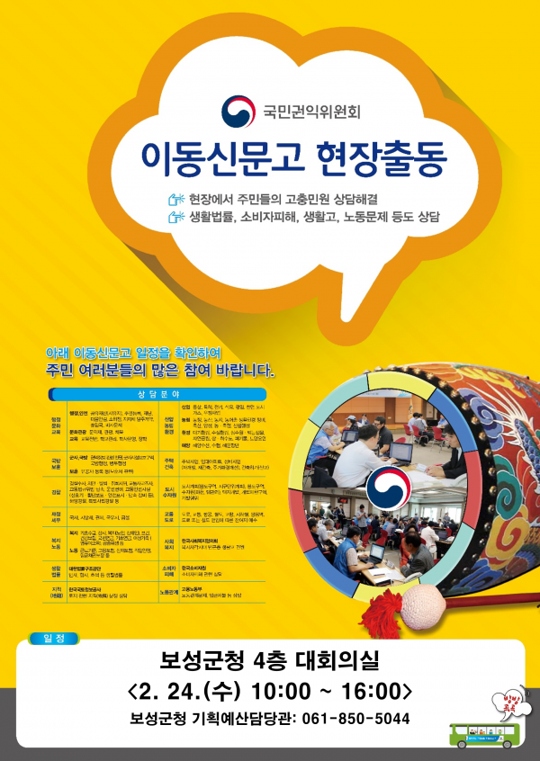 [한국Q뉴스] 보성군은 국민권익위원회 주관으로 오는 24일 오전 10시부터 오후 4시까지 보성군청 4층 대회의실에서 이동신문고를 운영한다.