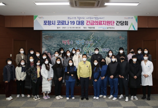 간담회 현장을 방문한 이강덕 포항시장은 추운 환경과 감염 위험에도 불구하고 코로나19 최전선에서 근무해준 긴급의료지원단을 격려하며 설 연휴 기간에도 애써주심에 감사의 뜻을 전하고 격려품을 전달했다.