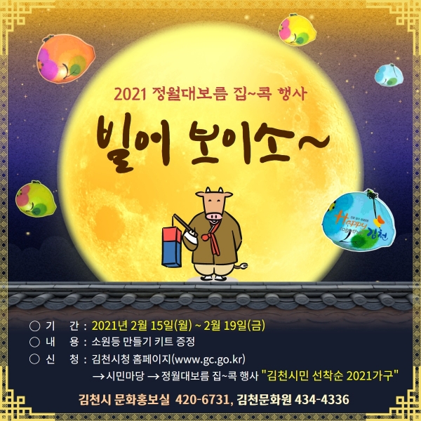 오는 2월 15일~2월 19일까지 김천시청 홈페이지→시민광장→2021 정월대보름 집~콕행사 게시판에 신청하면 된다.