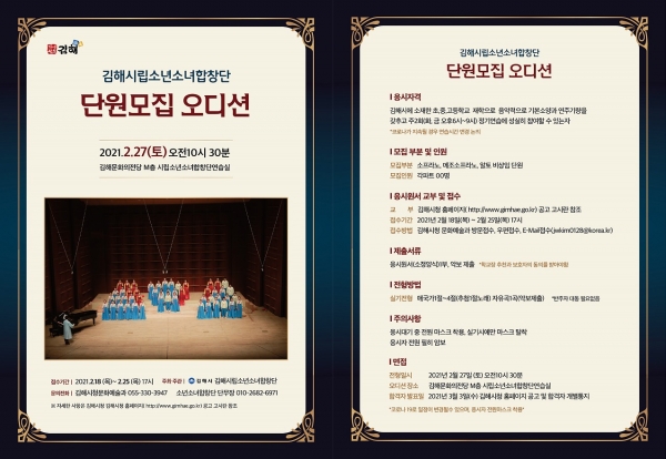 시립소년소녀합창단 단원 모집은 소프라노, 메조소프라노, 알토 각 파트별로 모집하고 있으며 접수는 공고일 현재 김해시에 거주하는 10세 이상 19세 이하의 청소년으로 음악적 기본소양을 갖추고 주2회 정기연습에 성실히 참여할 수 있다면 누구나 응시가 가능하다.