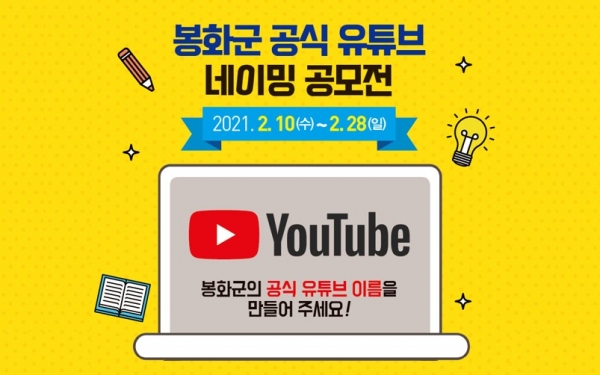 군은 이번 공모전을 통해 올해 새롭게 개설되는 봉화군 공식 유튜브 채널을 널리 알리고 참신하고 다양한 아이디어를 수렴해 봉화군을 대표할 수 있는 이름을 선정할 계획이라고 전했다.