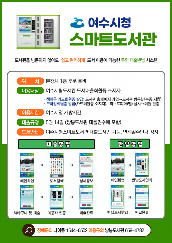 [한국Q뉴스] 여수시는 여수시청 1층 후문 로비에 ‘스마트도서관’을 설치, 15일부터 운영에 들어간다고 밝혔다.