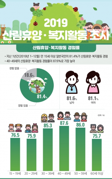 우리나라 만 15세 이상 국민의 81.4%는 산림휴양·복지활동을 경험했으며 ‘휴양과 휴식’을 위해 산림을 방문하고 자연휴양림 시설의 이용경험과 이용의향이 가장 높은 것으로 조사됐다.