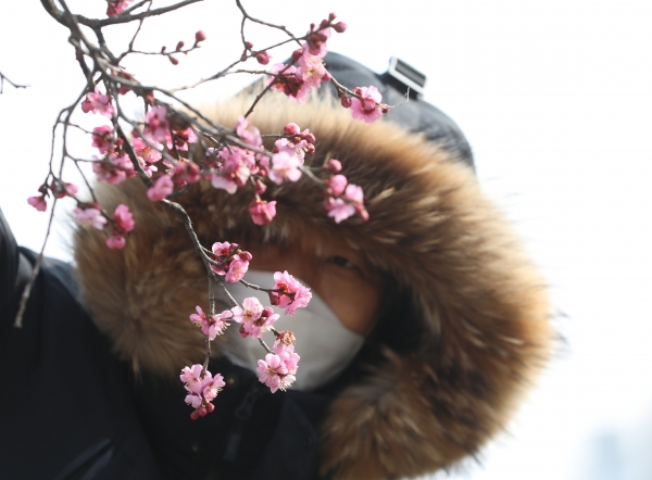 [한국Q뉴스] 눈이 녹아서 비가 된다는 ‘우수’를 사흘 앞둔 15일 경남 함양군 함양읍 한 주택가에서 강한 찬바람을 이기며 꽃망울을 터뜨린 홍매화가 활짝 피어 고개를 내밀고 있다.