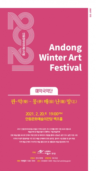 [한국Q뉴스] ‘2021안동윈터아트페스티벌 AWAF’의 세 번째 공연 ‘예악국악단, 판·악 - 몽매난망’이 오는 20일 오후 7시 안동문화예술의전당 백조홀에서 진행된다.
