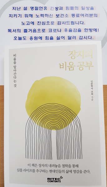 보건소는 매주 독서를 통해 남보다 먼저, 깊게 생각하고 창의적인 업무 수행을 할 수 있도록 할 계획이며 코로나19 임시예방접종 준비를 지혜롭게 추진해 나갈 것이다.