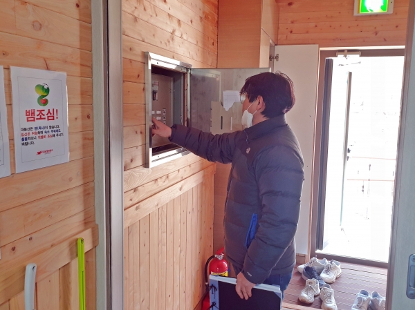군에 따르면 15일 오후 휴양밸리과 시설운영담당 직원으로 구성된 점검팀이 대봉캠핑랜드 단체숙박시설인 사나래관을 시작으로 불로초둥지를 포함해 숲속의 집 등 35개소에 대해 전기누전테스트 등 안전검검과 조명시설 조도테스트 등 운영점검을 병행 실시했다고 전했다.