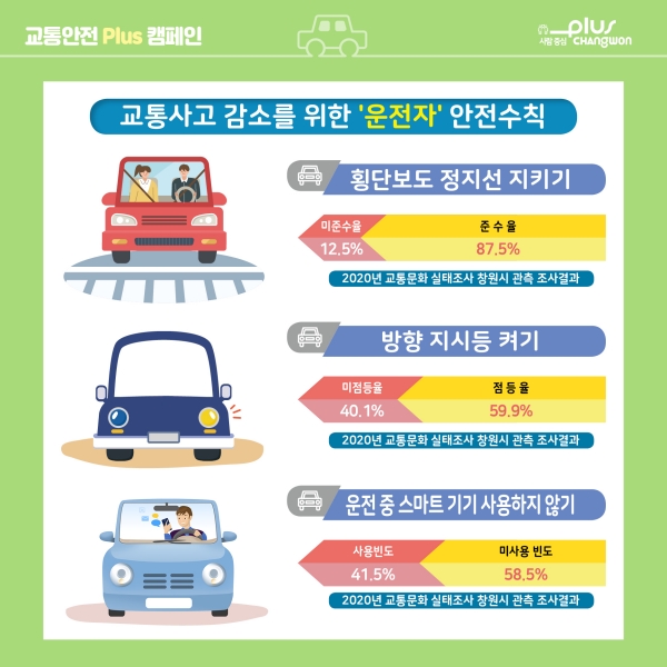 [한국Q뉴스] 창원시는 올해 플러스 성장 원년을 맞이해 교통안전문화 확산을 통한 시민 일상의 플러스 성장을 실현하고자 교통사고 원인분석으로 개선이 필요한 내용을 매월 주제로 선정해 ‘교통안전 Plus 캠페인’을 전개하고 있다고 16일 밝혔다.