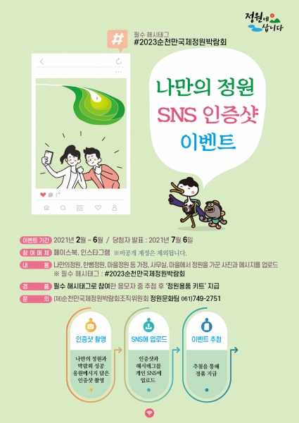 조직위는 개인이 가꾼 정원과 함께 박람회 성공 응원 메시지를 담은 인증샷을 SNS에 올리는 방식으로 정원문화 붐을 조성하기 위해 추진하게 됐다.