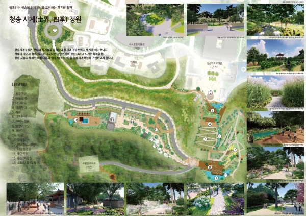 주요 테마는 정원의 시작과 만남의 장이 형성되는 ‘청송마당’, 도자예술과 문화프로그램이 있는 ‘예술의 뜰’, 청송의 투박함과 자연성을 담은 ‘두메누리원’, 청송의 너덜돌 등 자연소재와 다양한 수목이 어울리는 ‘향설원’, 청송의 선비정신을 표현하는 ‘꽃마루원’, 선비의 사색과 풍류를 상징하는 ‘오월원’ 등 여섯 가지로 구성된다.