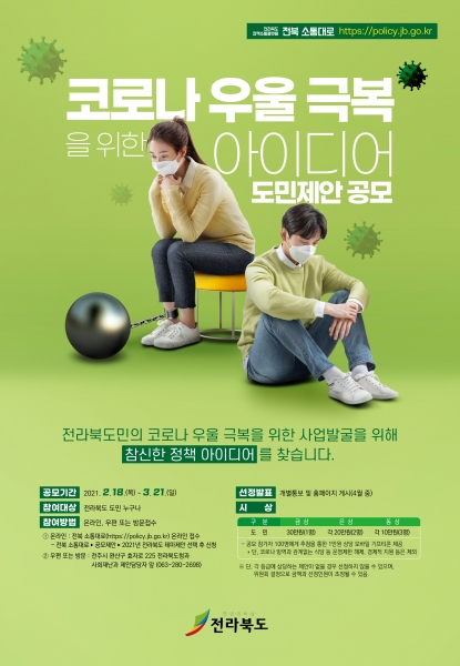 코로나19로 특히 더 어려운 소상공인, 취약계층분들의 우울감을 덜어주기 위해 실시하는 이번 공모전에 많은 도민들이 응모해주시기 부탁드린다”며 "뜻깊은 공모전이 되기를 바라며 실행가능한 당선작은 즉시 실행해 코로나19를 함께 이겨나갈 수 있는 작은 마중물이 되기를 희망한다"고 강조했다.
