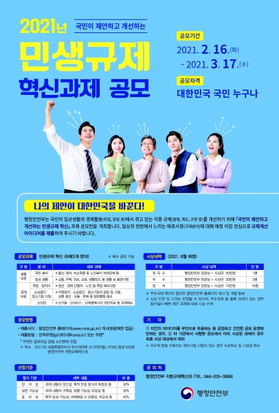 공모는 16일부터 다음달 17일까지 한 달간 실시되며 이번 공모를 통해 국민의 일상생활과 취업·중소기업지원 등 경제활동에서 겪고 있는 각종 규제를 개선하기 위한 아이디어를 접수 받는다.