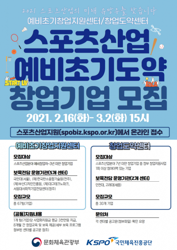 [한국Q뉴스] 문화체육관광부는 국민체육진흥공단과 함께 스포츠산업의 유망 사업모델을 새롭게 발굴하고 코로나19로 어려움을 겪는 스포츠기업을 지원하기 위해 ‘2021년 스포츠산업 창업기업 지원 사업’에 참여할 기업을 2월 16일부터 3월 2일까지 모집한다.
