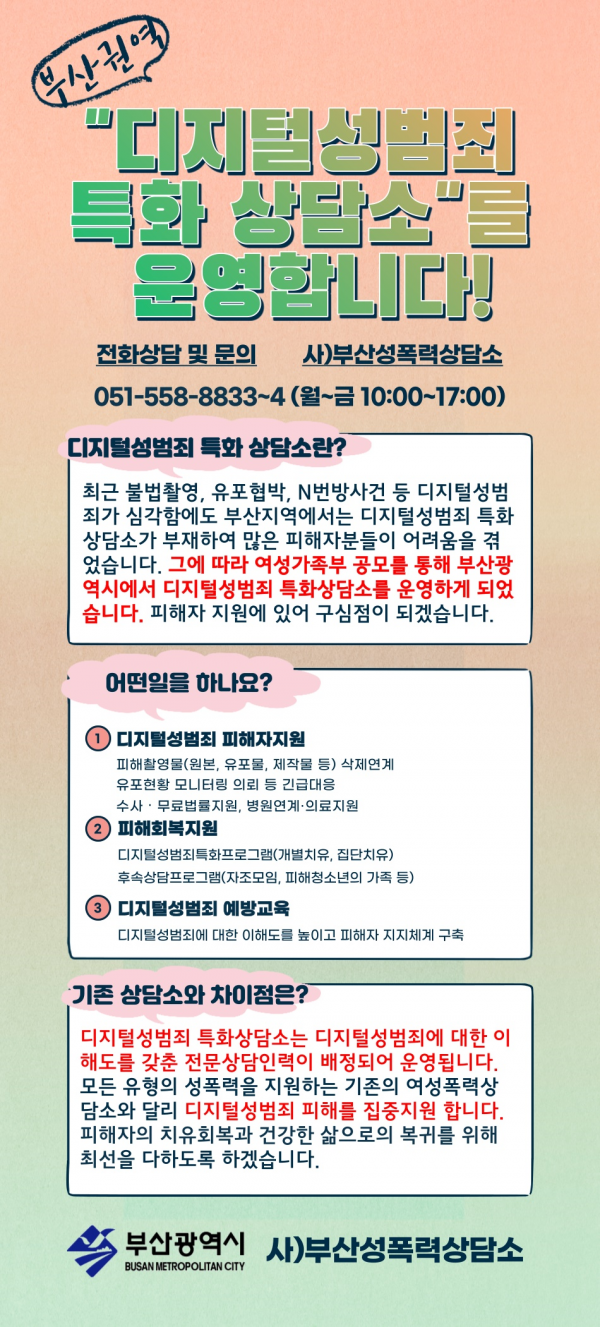특히 원활한 사업추진을 위해 내일 오전 11시 시청 7층 영상회의실에서 부산경찰청 사회복지공동모금회, 부산대학교병원과 ‘디지털성범죄 예방 및 피해자 지원 업무협약’을 체결한다.