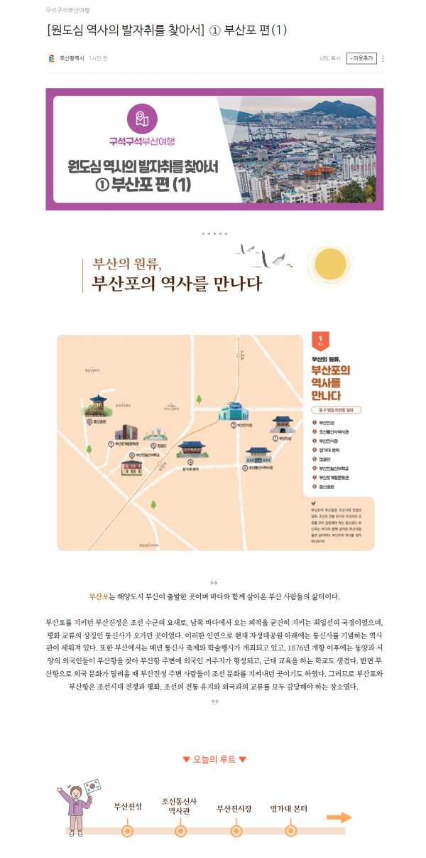 [한국Q뉴스] 부산시는 원도심 문화유산을 찾아 떠나는 답사기‘原도심 역사의 발자취를 찾아서’를 부산시 공식 블로그에서 만날 수 있다고 밝혔다.