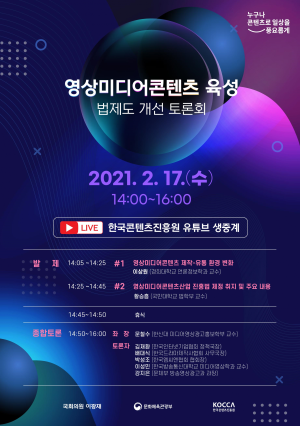 이번 토론회는 코로나19 확산 방지를 위해 온라인 방식으로 진행하며 한국콘텐츠진흥원 공식 유튜브 채널을 통해 생중계된다.