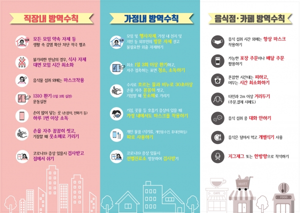 새로운 사회적 거리두기는 집합금지 및 영업제한 등의 강제 조치는 최소화 하고 자발적인 방역 수칙 준수와 책임성을 높이는 방향으로 개편되어 김천시는 시민 스스로가 방역수칙을 철저히 지킬 수 있도록 가정 내, 직장 내, 음식점 내 준수 사항을 안내하는 리플릿 2만부를 제작해 실과소, 읍면동에 배부했다.