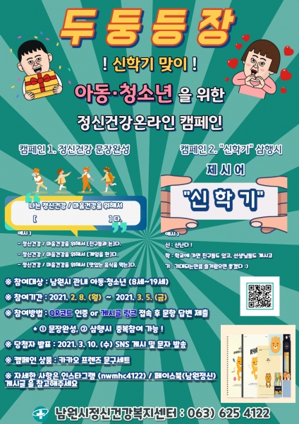 [한국Q뉴스] 남원시 보건소는 관내 아동·청소년 대상으로 건강하고 밝은 신학기를 맞이할 수 있도록 “온라인 콩닥콩닥 신학기 정신건강 이벤트”를 진행하고 있다.