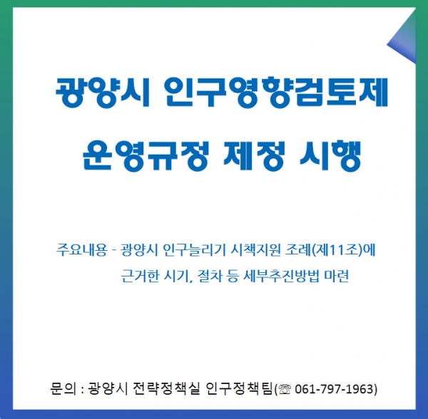운영규정은 인구영향검토제 이행의 내부관리를 강화하고 실행력을 확보하자는 취지에서 제정했으며 ‘광양시 인구늘리기 시책 지원 조례’에 명시되어 있는 인구영향검토제의 세부내용을 상세히 규정하고 있다.