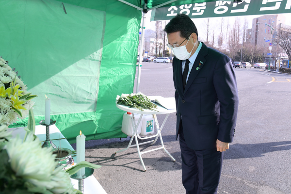 [한국Q뉴스] 권오봉 여수시장이 17일 오전 여수시청 앞 로터리에 마련된 고 백기완 통일문제연구소장 시민분향소를 찾아 조문하고 있다.