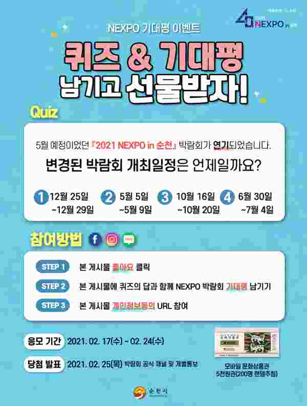 ‘2021 NEXPO in 순천 퀴즈&기대평 남기고 선물받자’이벤트는 박람회 공식 SNS 채널을 통해 2월 17일부터 24일까지 진행된다.