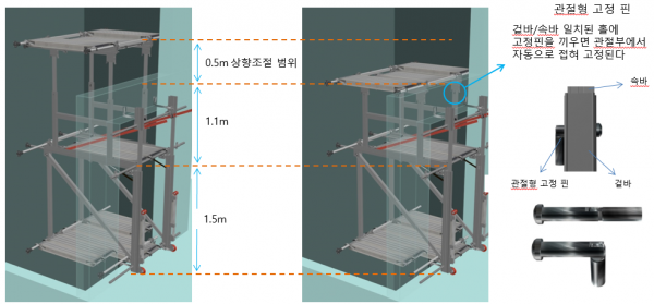 ‘엘리베이터 설치와 유지보수 시 안전작업기준 및 전용발판 개발’ 연구에서는 추락사고 위험이 큰 승강로 내부에서 안전하게 설치해 사용할 수 있는 ‘엘리베이터 전용 시스템 비계’를 제안하고 실제 시제품을 개발하는 성과를 냈다.