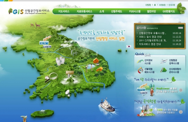 산림공간정보서비스는 산림의 위치정보 및 속성정보를 분석해 산사태 위험지도, 임상도, 산지 구분도, 임도망도 등 객관적인 산림공간정보를 통합해 제공하는 시스템이다.