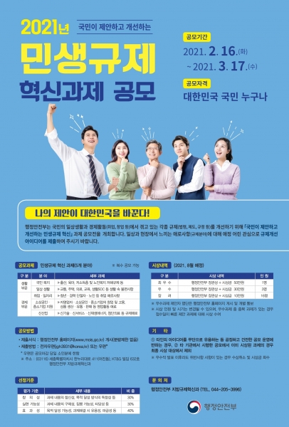 [한국Q뉴스] 행정안전부는 지난 2월 16일부터 오는 3월 17일까지 30일 동안 경상남도, 진주시와 함께 ‘2021년 민생규제 혁신과제 공모전’을 개최한다.