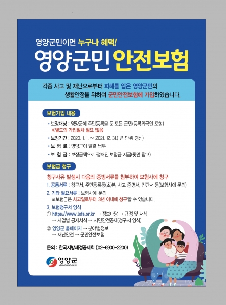 [한국Q뉴스] 영양군은 갑작스러운 사고로 경제적 어려움에 처한 군민들의 생활안정과 복지향상에 기여하고자 지난해에 이어 올해도 군민안전보험에 가입했다.