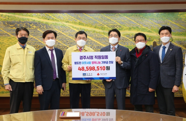 [한국Q뉴스] 경주시에서는 18일 시청 대외협력실에서 ‘범도민 이웃사랑 행복나눔 캠페인’을 실시해 모은 4,859만8,510원의 기부금을 경북사회복지공동모금회에 전달했다.