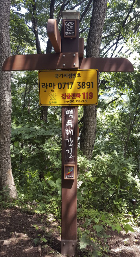 18일 장수군에 따르면 국가지점번호판은 건물이 없는 비거주 지역에 격자형으로 지점을 나누고 산악·해안지역 등 도로명주소가 없는 곳, 인명피해 등 사고발생 빈도가 높아 국가지점번호의 설정이 필요한 곳 지점마다 한글 2자와 숫자 8자리로 구성된 번호를 부여해 산악·해안지역 등에 긴급 상황 발생 시 신속한 구조를 위해 설치하는 위치 표시 체계 번호판이다.