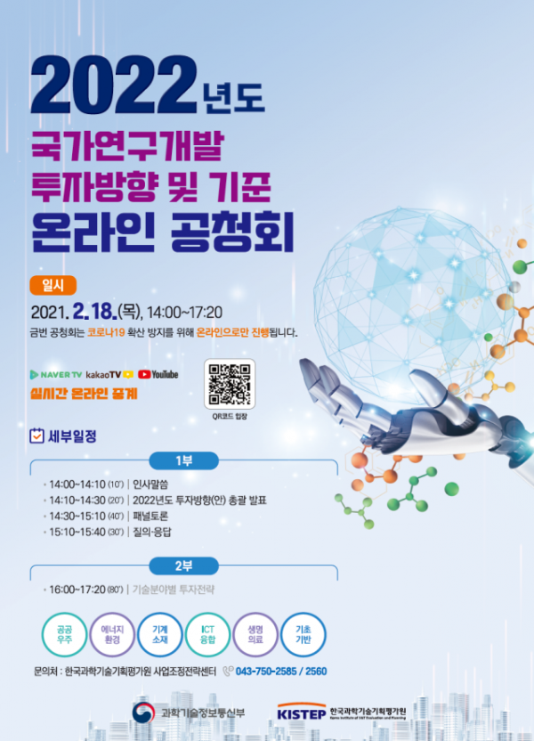[한국Q뉴스] 과학기술정보통신부는 2월 18일 오후 2시부터 2022년도 국가연구개발 투자방향 및 기준 마련을 위한 공청회를 온라인 생중계로 개최한다.