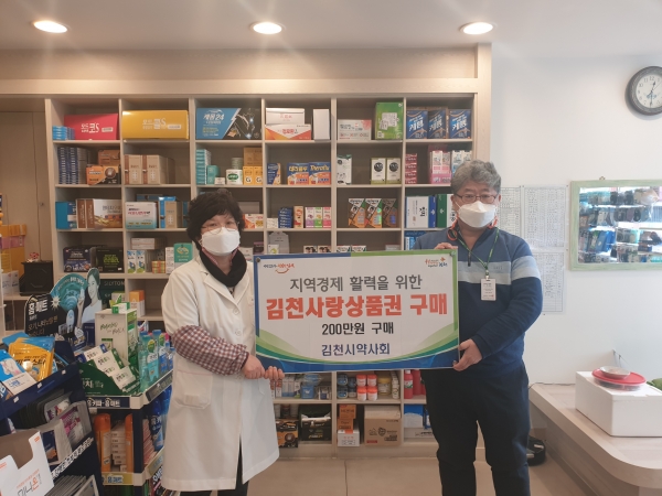 김천시 약사회에서는 코로나19로 어려운 경제위기 극복에 힘을 보태고자 김천사랑상품권 200만원을 구매했고 그 중 100만원을 어려운 이웃들을 위해 써달라며 경북공동모금회에 기부해 소상공인들과 불우이웃을 위한 아름다운 기부와 착한 소비문화 조성이라는 1석 2조의 역할을 했다.
