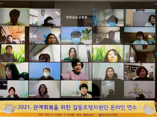 [한국Q뉴스] 전라남도교육청은 2월 17일 ~ 19일 3일 동안 22개 교육지원청에서 추천한 지역민 54명을 대상으로 학교폭력 갈등조정지원단 온라인 연수를 실시했다.