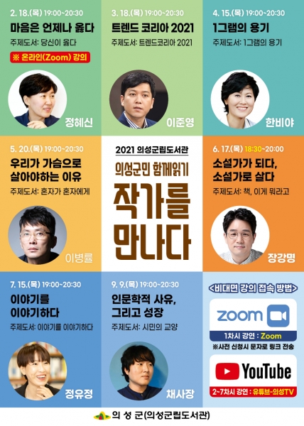 한편‘의성군민 함께읽기:작가를 만나다’는 이번 강연 이후에도 9월까지 월 1회 베스트셀러 작가를 초청해 강연을 진행한다.