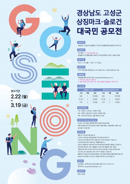 [한국Q뉴스] 고성군은 고성군을 상징하는 특색 있고 차별화된 상징물과 통합슬로건 디자인 선정을 위해 ‘경상남도 고성군 상징물 및 통합슬로건 대국민 공모전’접수를 시작한다고 전했다.