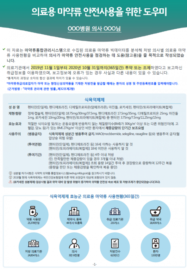 도우미 서한의 주요 내용은 전체 의료용 마약류 및 식욕억제제 사용현황, 의사 본인의 처방현황, 각종 통계 등이다.