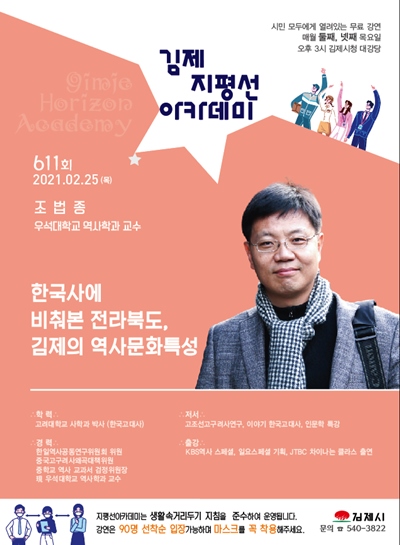 조법종 교수는 ‘한국사에 비춰본 전라북도, 김제의 역사문화특성’이라는 주제로 열리는 이날 강연에서 김제의 주요 유적과 관련된 역사 및 문화에 대해 알아볼 예정이다.