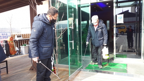 군위읍은 22일 방역전문인력 6명으로 소재지를 순회하며 소독희망지에 대해 실내 및 문손잡이 소독 등 대대적인 방역·소독을 실시했다.