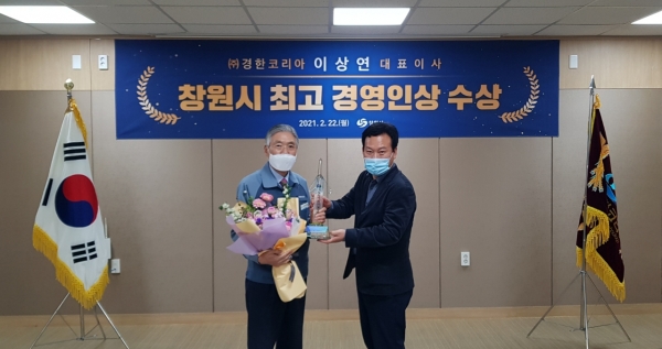[한국Q뉴스] 창원시는 창원경제를 빛낸 최고 경영인으로 선정된 ㈜경한코리아 이상연 대표를 만나 최고경영인 시상식을 가졌다고 23일 밝혔다.