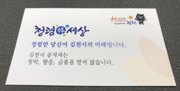 [한국Q뉴스] 김천시 열린민원과는 공무원 부조리를 사전 예방하고 시민과 소통하는 청렴문화 확산을 위해 청렴명함을 제작했다.