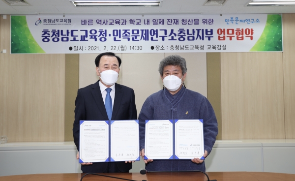 [한국Q뉴스] 충남교육청과 민족문제연구소 충남지부은 지난 22일 교육청에서 바른 역사교육과 일제 잔재 청산을 위한 업무협약을 맺었다양 기관은 협약을 계기로 학교 내 일제 잔재 청산 사업과 바른 역사교육을 위해 협력을 강화하고 충청 지역의 독립운동과 근현대사 관련 사업 연계를 활성화하기로 약속했다.