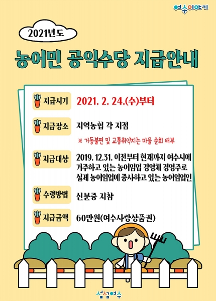 [한국Q뉴스] 여수시가 지난해 이어 두 번째로 지급되는 농어민 공익수당을 코로나19로 어려움을 겪고 있는 농어업인과 지역 소상공인을 위해 24일부터 지역농협을 통해 일괄 지급한다고 밝혔다.